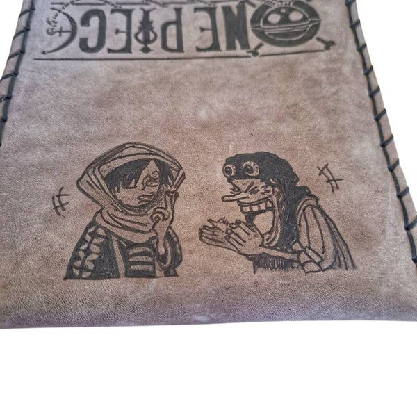 Χειροποίητη καπνοθήκη από γνήσιο δέρμα, διακοσμημένη με λεπτομερή πυρογραφία εμπνευσμένη από το αγαπημένο anime One Piece. Η παράσταση αποτυπώνει με ακρίβεια και χιούμορ δύο χαρακτηριστικούς ήρωες, ενώ το λογότυπο του One Piece κοσμεί την επάνω πλευρά.