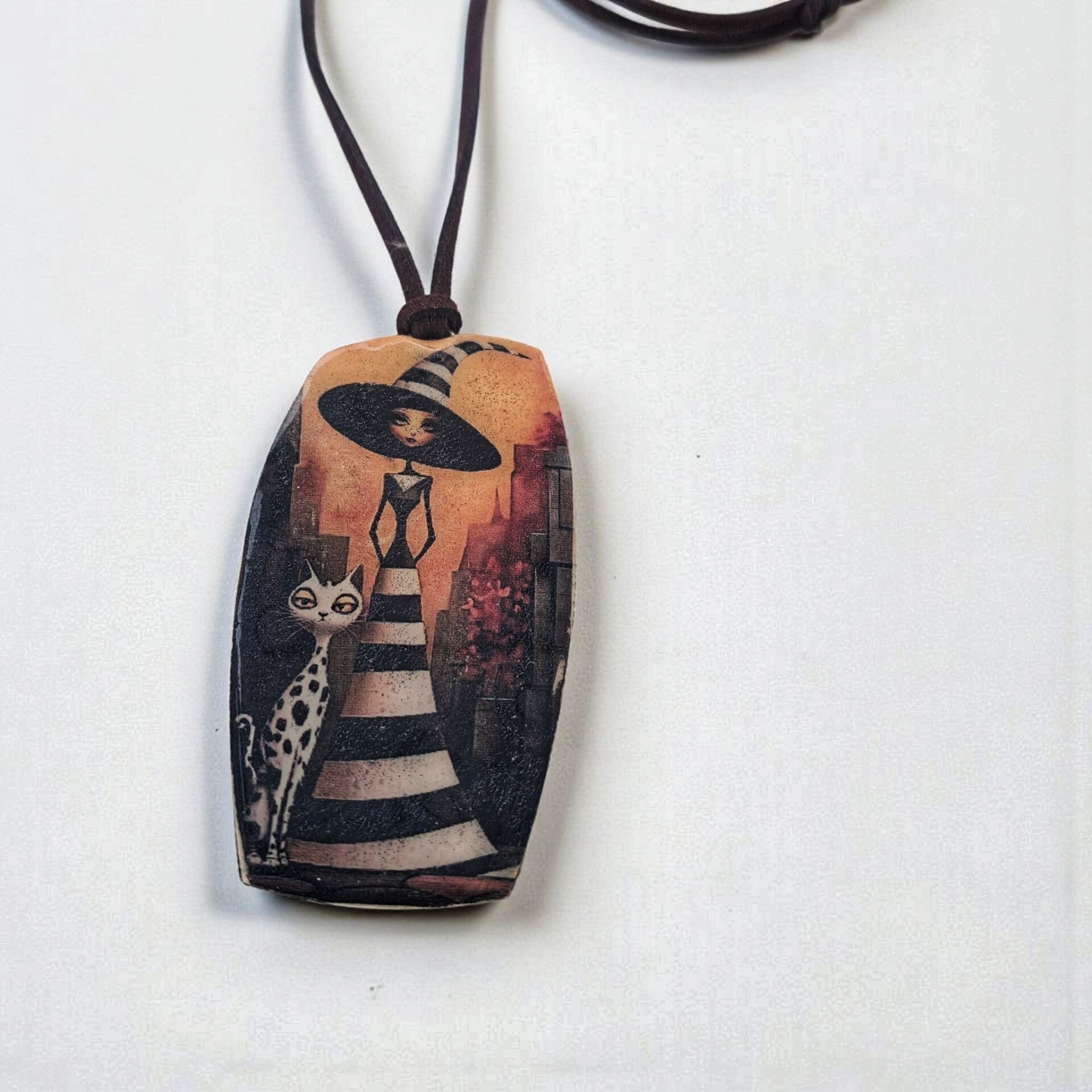 Χειροποίητο μενταγιόν από πολυμερικό πηλό, με μεταφορά εικόνας μιας γυναίκας που ξέρει τι θέλει και μιας γάτας που δεν σηκώνει αντιρρήσεις.