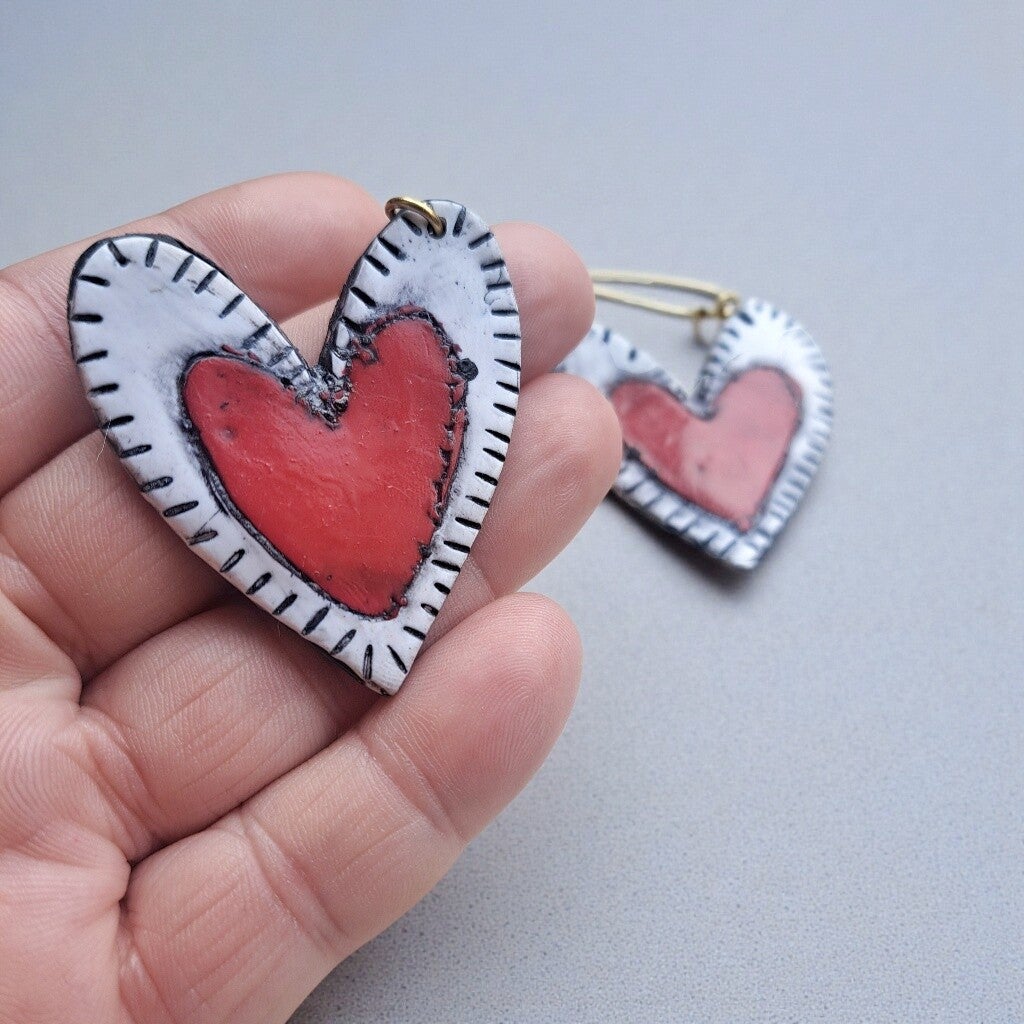 Σκουλαρίκια καρδιά από πολυμερικό πηλό, φτιαγμένα στο χέρι ένα-ένα, με μικρές ατέλειες που αποδεικνύουν ότι δεν βγήκαν από εργοστάσιο αλλά από άνθρωπο με καφέ δίπλα του.